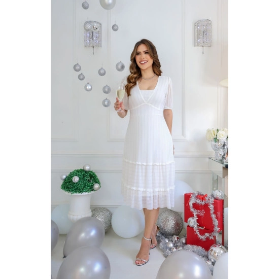 Vestido Lola Em Tule de Malha Maquinetado Branco Maria Amore Alto Verão 2025