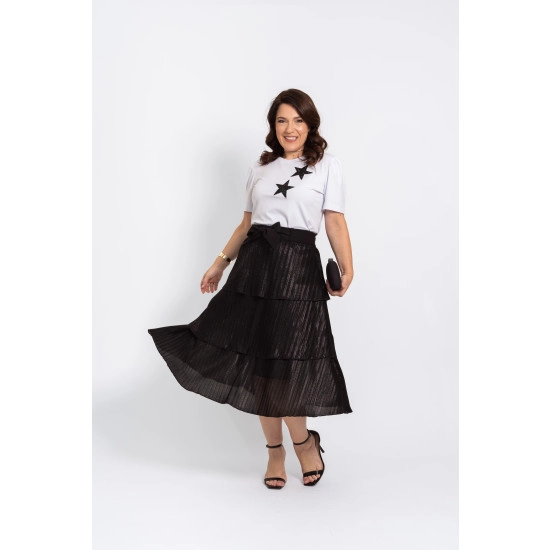 Saia Midi Em Camadas Em Malha Plissê Com Brilho Leva Preta Luciana Pais Alto Verão 2025