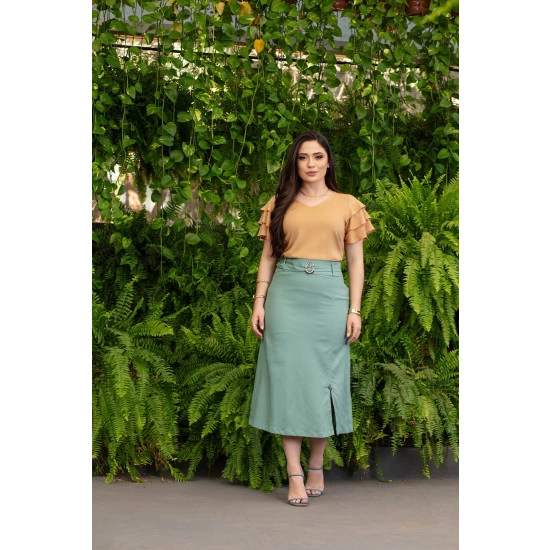 Saia Em Linho Evasê Pistache Mulher Morena Primavera/Verão 2026
