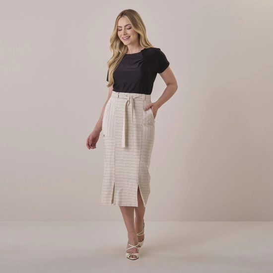 Saia Samanta Em Llinho Risca De Giz Bege Tatá Martello Primavera/Verão 2026