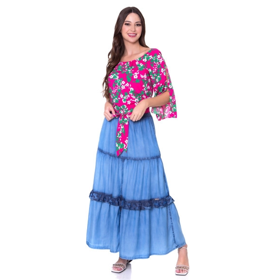 Blusa em tecido plano estampado, decote canoa com elástico interno, mangas ¾ flare com abertura, amarril frontal e elástico interno no punho das costas na barra da peça. Composição 100% viscose.