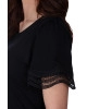 Blusa confeccionada em malha, decote com acabamento em revel e mangas curtas com barra em guipir.