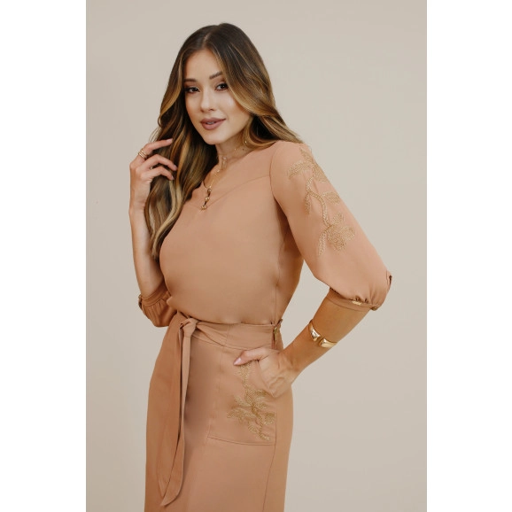 Blusa Bromélia Em Manga 3/4 Bege Plus Size Nitido