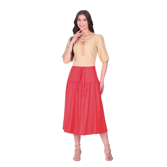 Blusa confeccionada em tecido planomaquinetado, decote com bordadoindustrial, detalhe em cordão e mangascom elástico interno na barra.