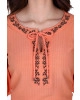 Blusa confeccionada em tecido planomaquinetado, decote com bordadoindustrial, detalhe em cordão e mangascom elástico interno na barra.