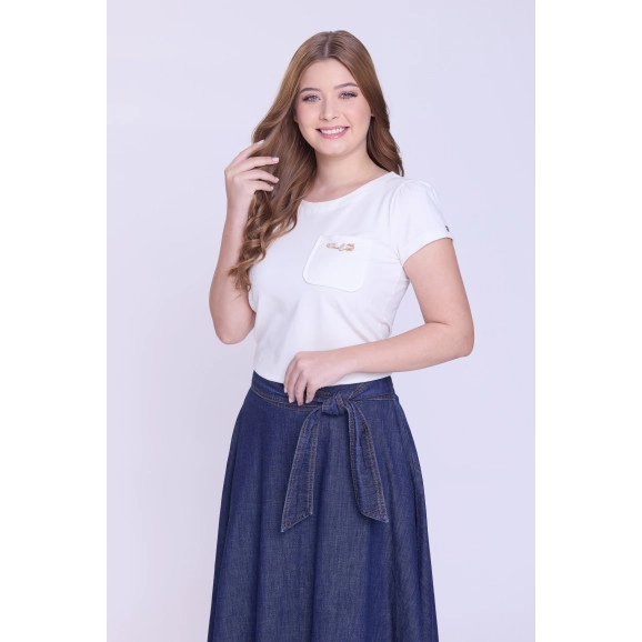 Blusa em malha piquet, decote redondo, bolso funcional com broche removível, mangas curtas e elástico interno barra.