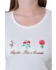 Blusa confeccionada em malha canelada, decote redondo, mangas com barra em picô, bordado industrial e bordado manual com mini pérolas frontais.
