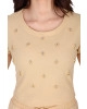 Blusa confeccionada em malha texturizada, decote redondo, bordado manual em strass frontal e mangas curtas.