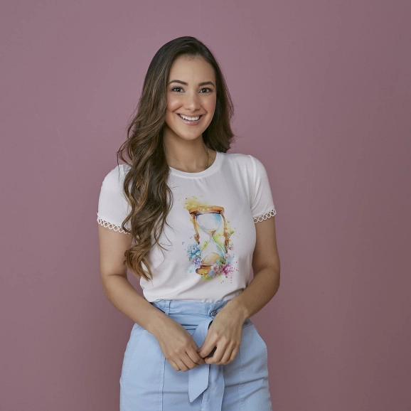 Blusa Tatá Martello confeccionada na malha viscolycra e crepe, estampa exclusiva, manga curta, decote arredondado e pequena abertura nas laterais, detalhe de aviamento na manga.