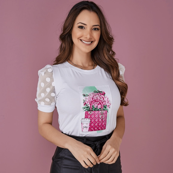 Blusa Tatá Martello confeccionada na malha Viscolycra (VISC UP LIGHT NEW), manga em tule e aplicação frontal. Composição: 94% Viscose 6% Elastano. Peça linda e charmosa, para você que ama uma peça delicada. -