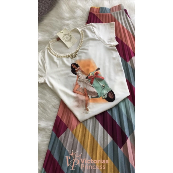 Blusa Estampa Motocicleta Victoria's Princess com detalhe em pérolas na gola, parte da frente confeccionada em 100% Poliester, verso 96% Viscose 4% Elastano. NÃO ACOMPANHA SAIA!