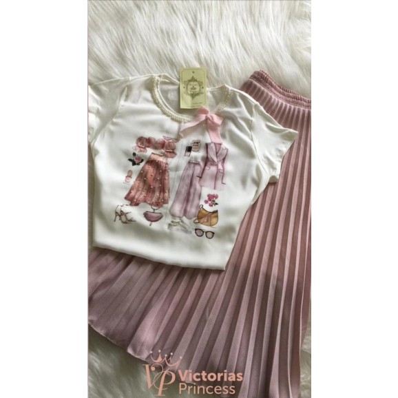 Blusa Estampa Roupas Victoria's Princess com detalhe em pérolas na gola, parte da frente confeccionada em 100% Poliester, verso 96% Viscose 4% Elastano. NÃO ACOMPANHA SAIA!