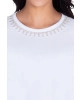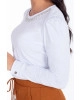 Blusa confeccionada em malha de algodão, decote com ribana e aplique de bordado manual e mangas com franzido e punho.