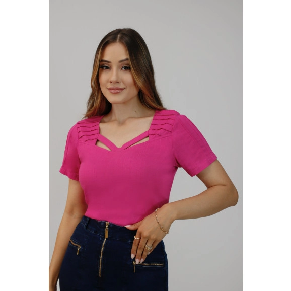 Blusa de viscolinho com detalhe de ombros com nervura e vazado no decote em tiras em V. Manga com nervura em todo o comprimento