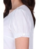 Blusa confeccionada em tecido plano deviscose, decote redondo com fechamentoem botões e mangas curtas com elásticointerno e babados.