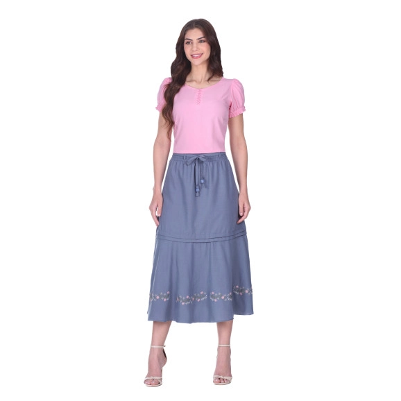 Blusa confeccionada em tecido plano deviscose, decote redondo com fechamentoem botões e mangas curtas com elásticointerno e babados.