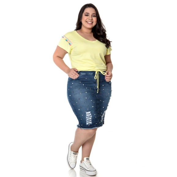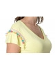 Blusa em malha, com decote em V, cava diferenciada com franjas coloridas e túnel com viés para regulagem na barra da peça.