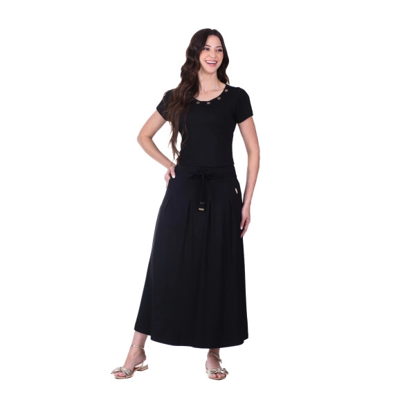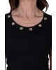 decote redondo com ilhós e mangas