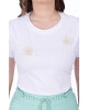 Blusa confeccionada em malha de algodão sustentável, decote redondo, bordado industrial frontal com aplicação em flores e mangas curtas.