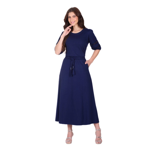 Blusa confeccionada em malha texturizada, decote redondo, mangas alongadas com leve franzido, detalhe em guipir vazado e elástico interno na barra.