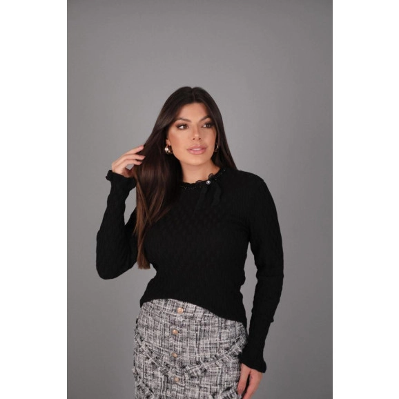 Blusa Lais Em Tricot Detalhe Delicado na Ribana, Com Pedraria na Gola