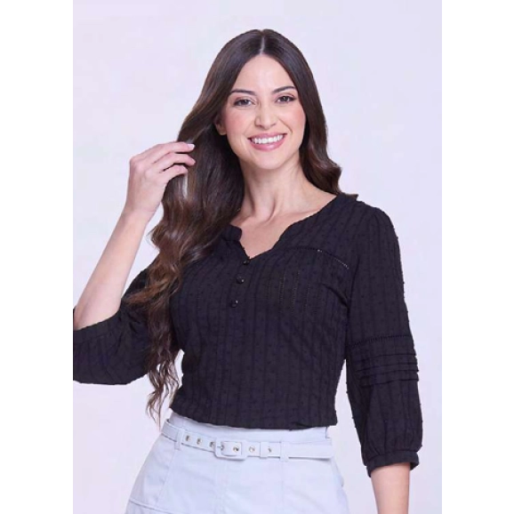 Blusa em tecido plano texturizado de viscose com algodão, decote redondo com detalhe V, botões fixos, detalhe em guipir e mangas com punho.