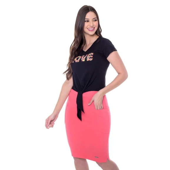 Composição: 96% algodão - 4% elastano. Fica linda com saias jeans!