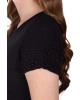 Blusa confeccionada em moletinho, decote redondo, cavas deslocadas, mangas com bordado manual em perolas e barra com cós.
