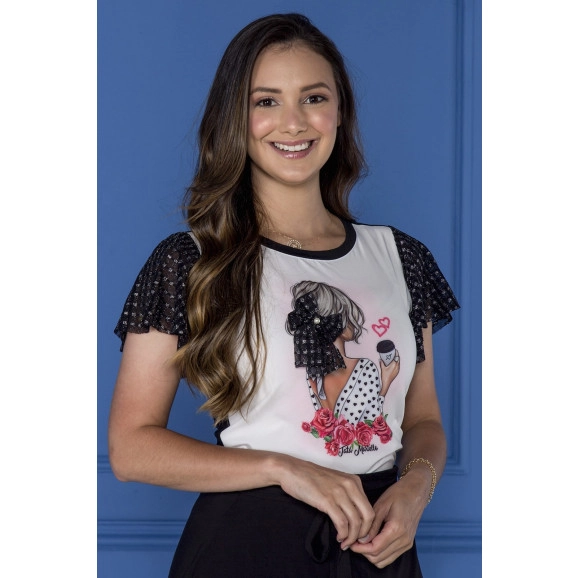 Blusa Tatá Martello confeccionada na malha viscolycra e crepe (kolona), estampa exclusiva, manga curta em tule lurex, decote arredondado.
