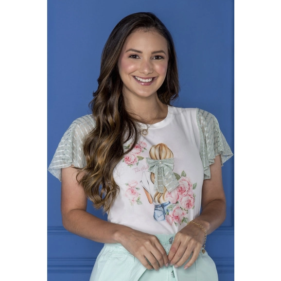 Blusa Tatá Martello confeccionada na malha viscolycra e crepe (kolona), estampa exclusiva, manga curta em tule lurex, decote arredondado.
