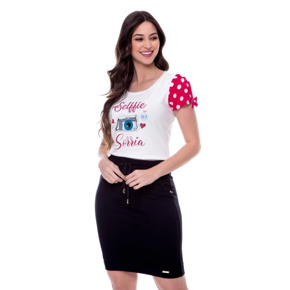 Blusa de malha algodão com mangas em viscose poá. Possui estampa e bordado manual, e lacinho aplicado nas mangas com pérola. Composição: 96% algodão- 4% elastano. Blusa linda, fica perfeita com saias jeans!