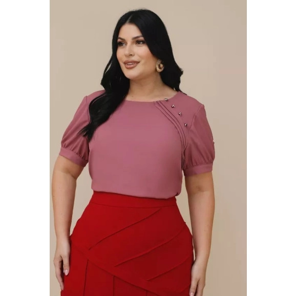 Blusa em crepe com detalhes em preguinhas e botões de coração, trazendo delicadeza ao visual.