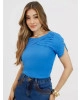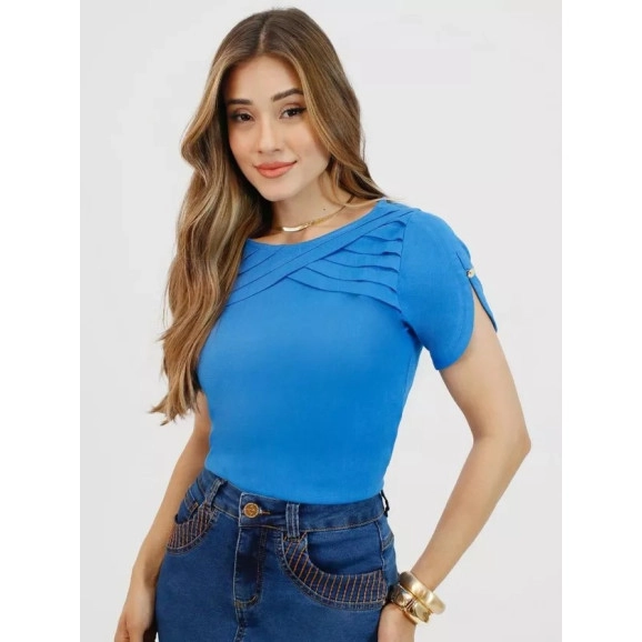 blusa de viscolinho com decote redondo em viés e fechamento traseiro com botão e abertura em gota. Detalhe de nervuras transpassadas no colo da peça e mangas com fenda e botão para detalhe.