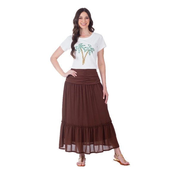 Blusa confeccionada em malha, decote redondo, estampa frontal com rico bordado manual em paetê, vidrilho e chaton e as mangas curtas