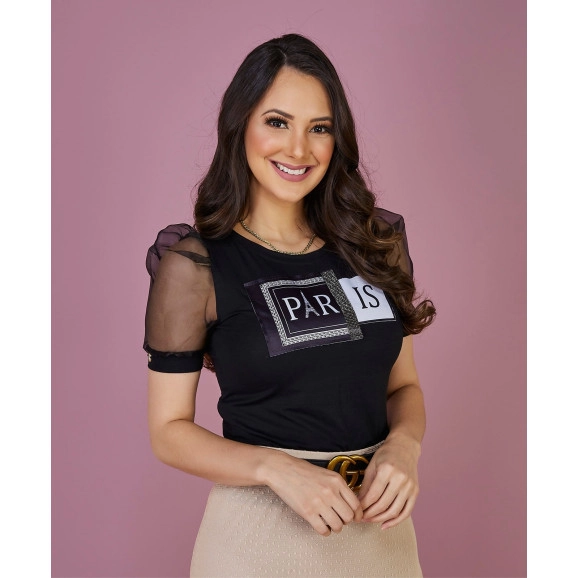 Blusa Organza Estampa Paris Tatá Martello , as mangas são em tecido organza, possui detalhe em termocolante na frente. Composição do Tecido 96%Viscose 4%elastano. Peça ideal para montar vários looks!