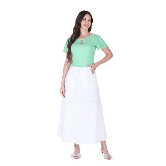 Blusa confeccionada em tecido plano, decote com botão funcional, detalhe em guipir nos ombros e franjinha na barra das mangas.