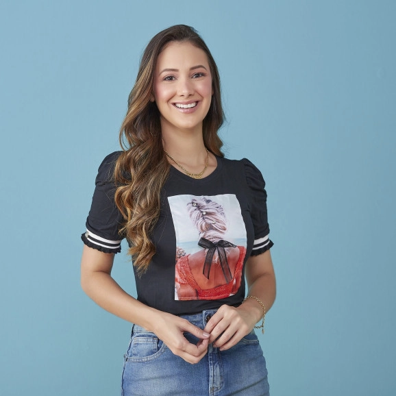 Blusa Tatá Martello confeccionada na malha viscolycra, manga princesa com punho em galão, aplicação frontal, decote arredondado.