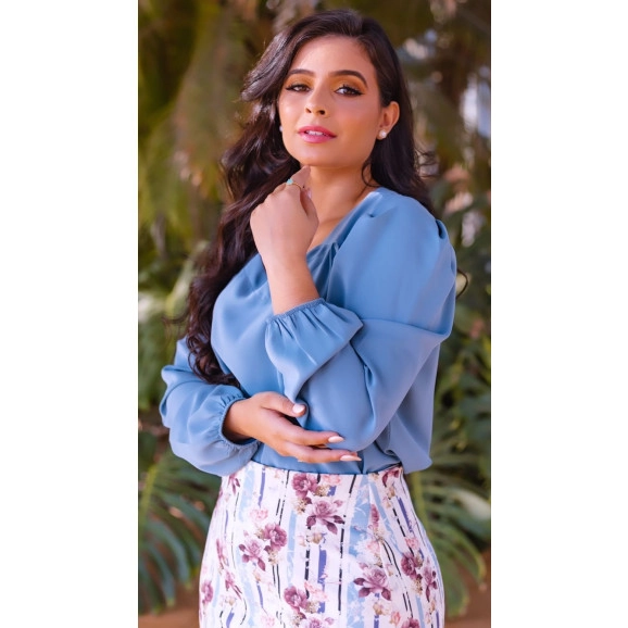 Blusa Rafaela em crepe com gola V e elástico na manga.