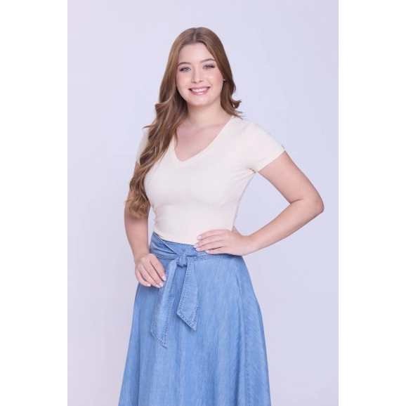 Blusa em malha canelada de viscose com elastano, decote em V e mangas curtas.
