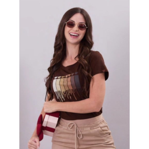 Blusa em malha, decote redondo, estampa frontal e mangas curtas.