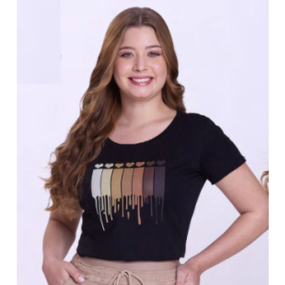 Blusa em malha, decote redondo, estampa frontal e mangas curtas.