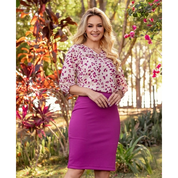 Blusa Rosane Estampada Detalhe em Bordado, tecido Sedinha.
