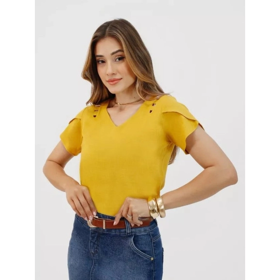 blusa de viscolinho com manga tulipa e detalhe em v no ombo com vazados em viés e acessório dourado. Acabamento de decote V em revel.