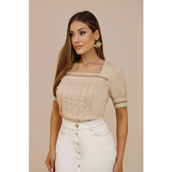 Blusa em viscolinho com toque leve e acabamento delicado renda rústica artesanal e detalhes com nervuras na frente.