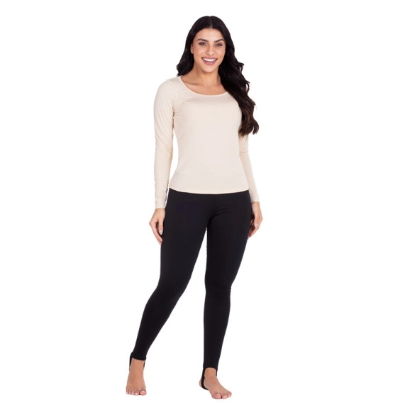 Blusa confeccionada em malha lisa térmica, decote redondo e suas mangas longas.