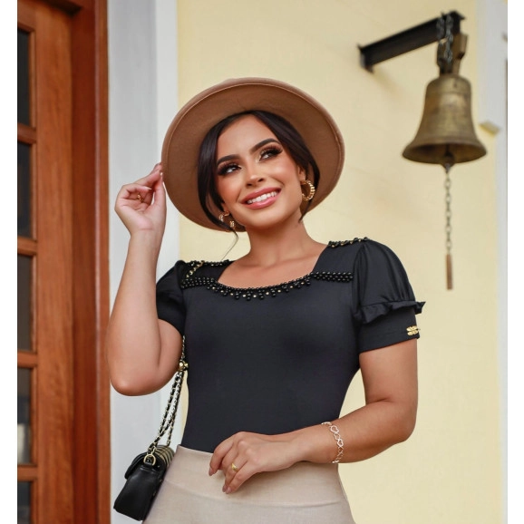 Body Bordado Com Babado Na Manga Em Suplex Preto Maria Amore