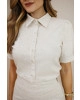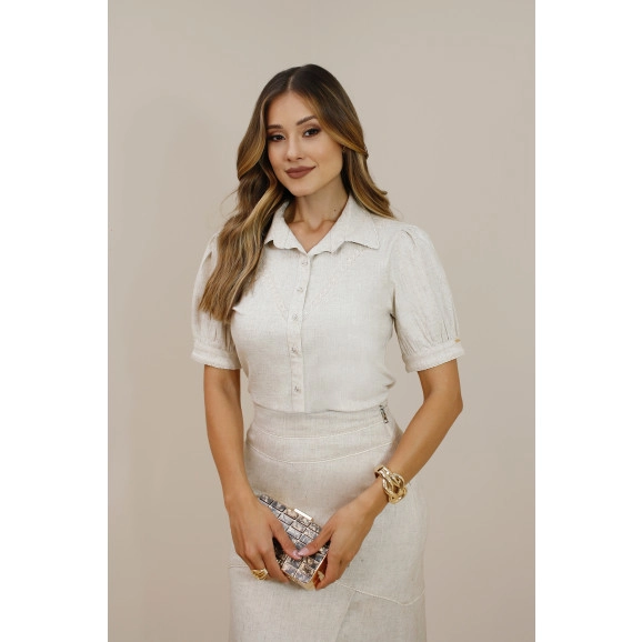 Camisa manga curta com gola tradicional, abotoamento frontal e mangas delicadamente estruturadas. recortes com rendinha delicada.