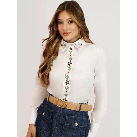 Camisa de tricolini, com gola e vista bordada. Possui mangas compridas e punho alongado. Fechamento em botão na vista escondida.