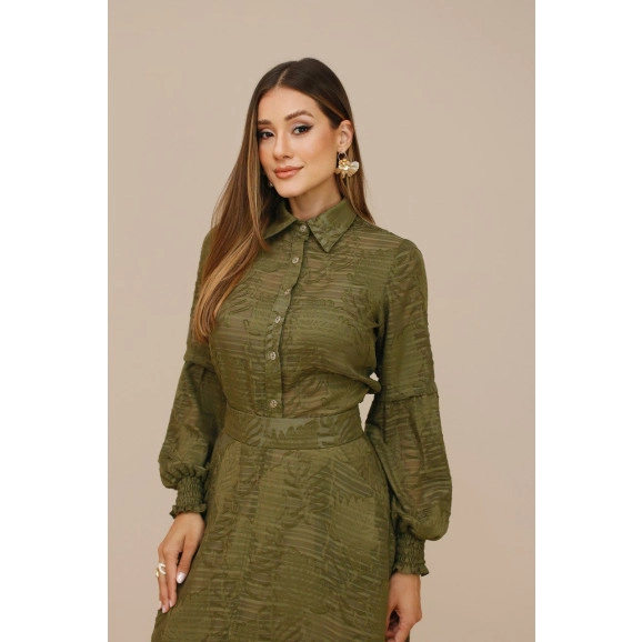 Camisa de manga longa em jacquard devorê. Tecido com textura sofisticada e leve transparência.