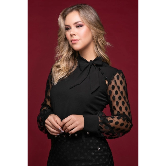 Camisa Preta Manga em Tule Via Tolentino possui detalhe em amarração na gola, detalhe em botões no ombro esquerdo, manga longa em tule poá. Composição do tecido é 100%poliester. Peça moderna e super despojada, ideal para montar vários looks!
